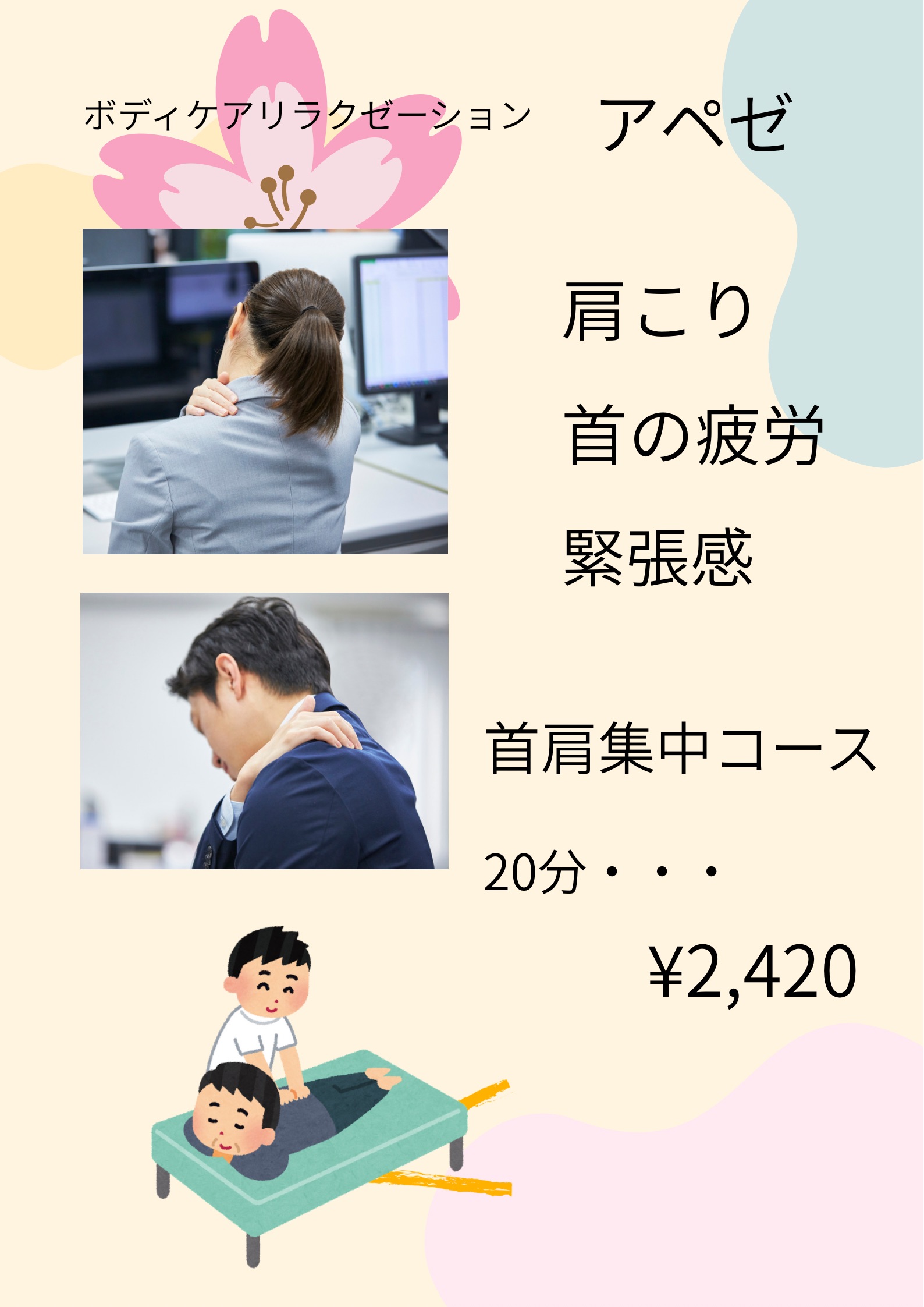 アペゼでは、首、肩集中20分コースのキャンペーンを実施中です。