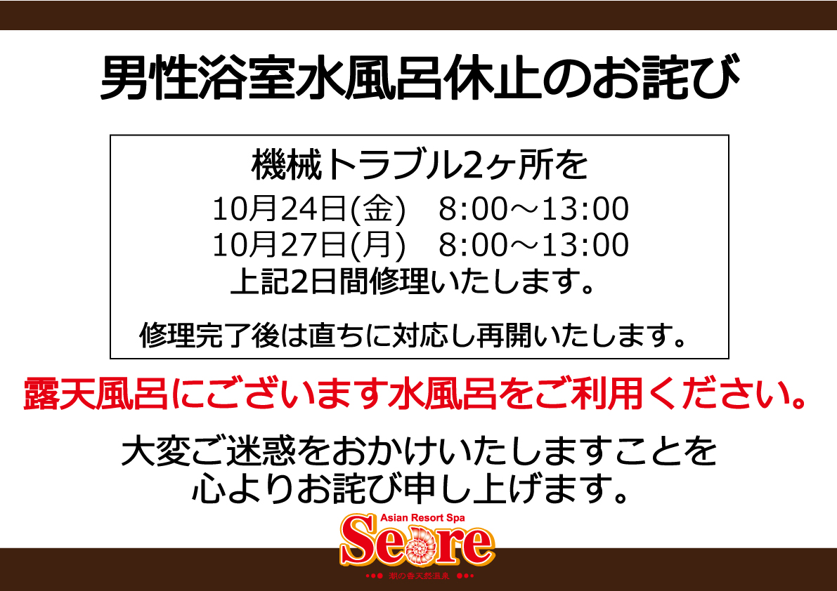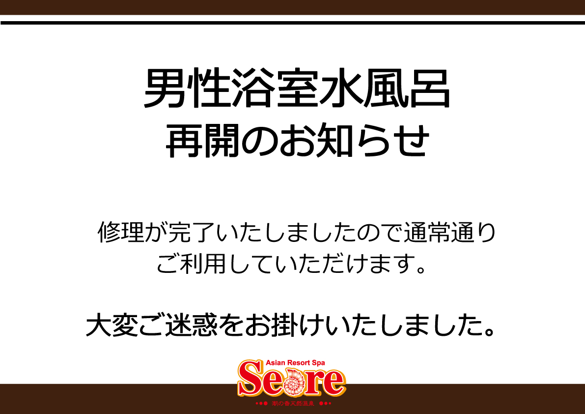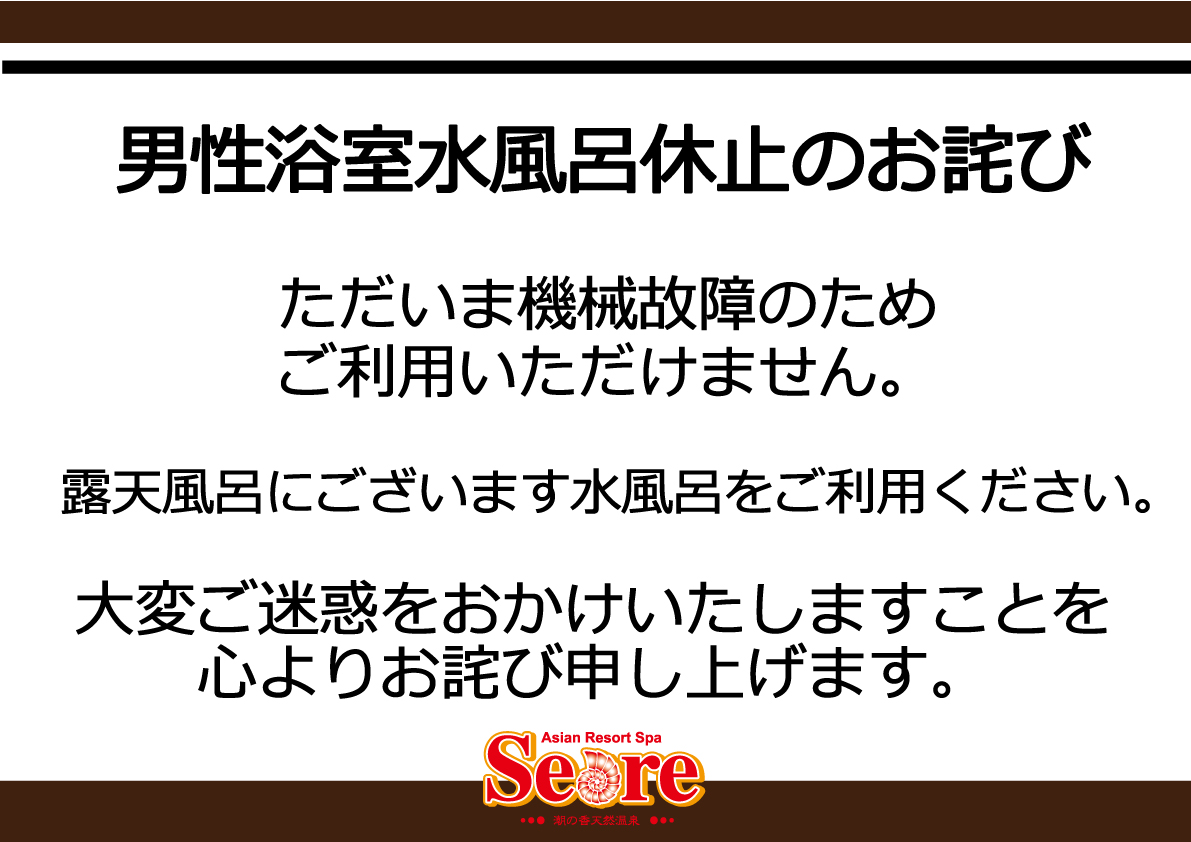 ただいま機械故障のため男性浴室水風呂をご利用いただけません。