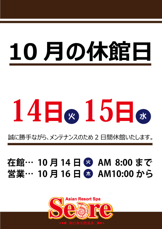 10月14日(火)・10月15日(水) 2日間メンテナンスのため休館いたします。